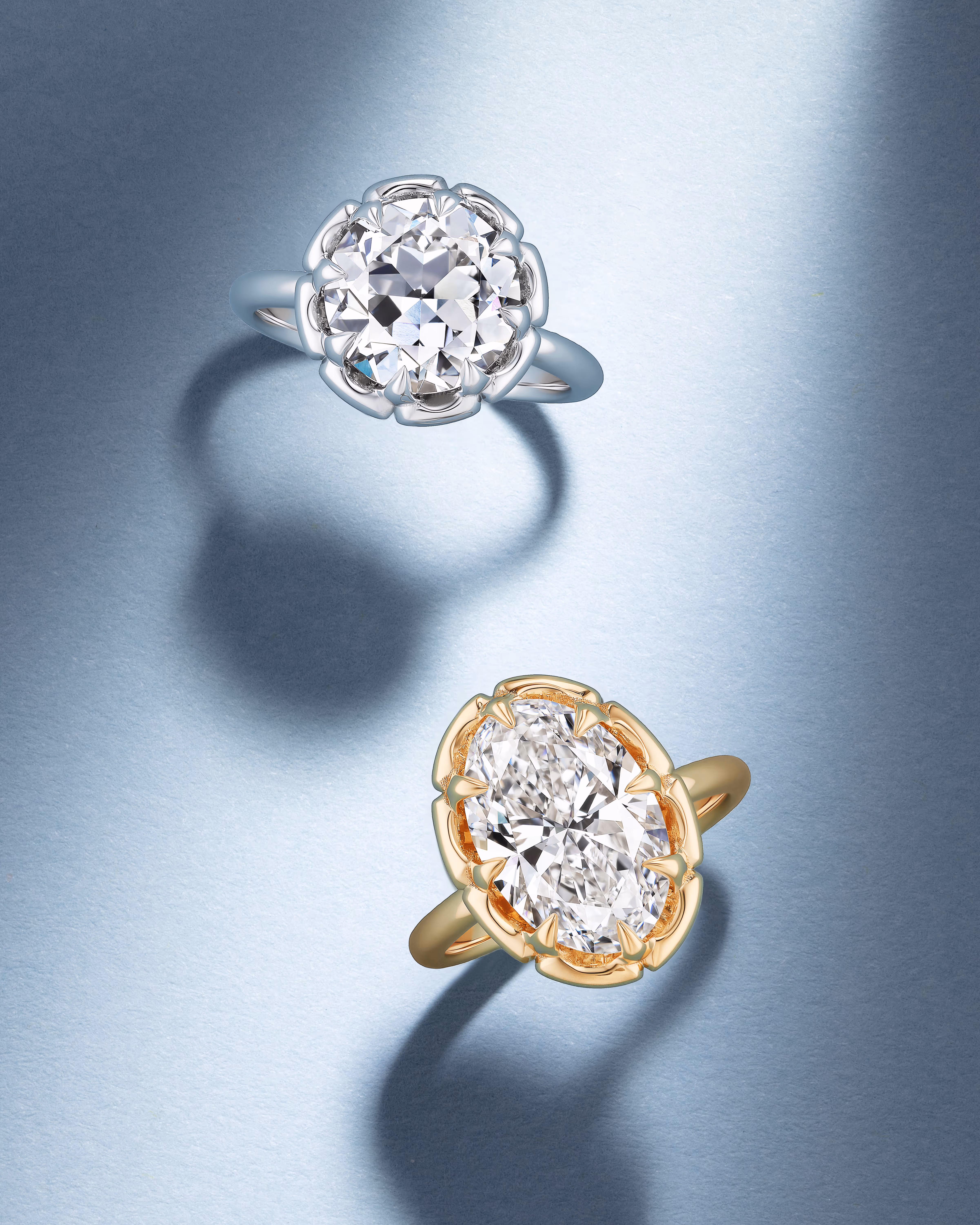 A quiet vow, forged in gold. The Juliette sets a lone oval diamond in a decorative belcher-like setting—heirloom-inspired and unmistakably romantic. Scalloped engravings and collet prongs rework vintage craftsmanship into something that feels both inherited and entirely new. Low-profile and secure, it whispers ‘I Do’ in Old English—and means it forever. Starting at $1,880.